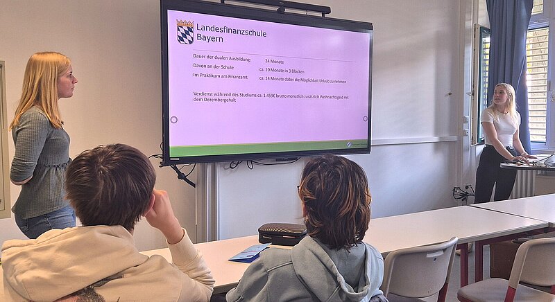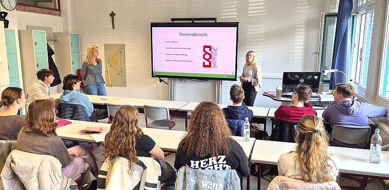 Im Rahmen der Wirtschaftsunterrichts der elften Klasse fand ein aufschlussreicher Vortrag aus der Reihe „Schule und Steuern“ des Finanzamts Straubing statt. Lehrer Lutz Müller begrüßte dazu die beiden Expertinnen Katja Pfeilschifter und Lisa Fechter, die in ihrem zweistündigen Workshop einen praxis- und schülernahen nahen Einblick in die Welt der Steuern ermöglichten.